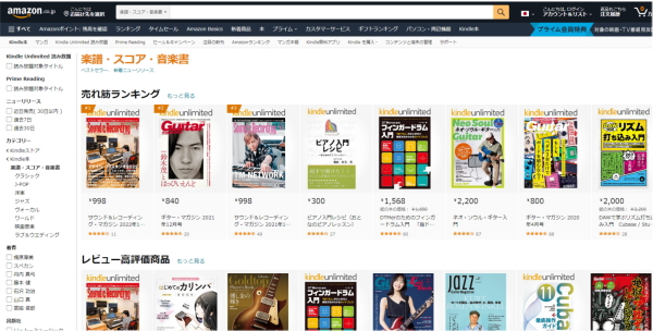 また、AMAZONは、一部楽譜(主に教則本やノウハウ系が多いですが)が電子書籍(Kindle版)に対応していて、タブレットで読むことも出来ます。Kindle Unlimitedの読み放題プラン(月額980円)に登録している人なら、マンガや雑誌、小説以外に、Kindle Unlimited(0円と表示されてるもの)に対応してる楽譜(教則本等)なら、追加料金なく見ることが出来ます。